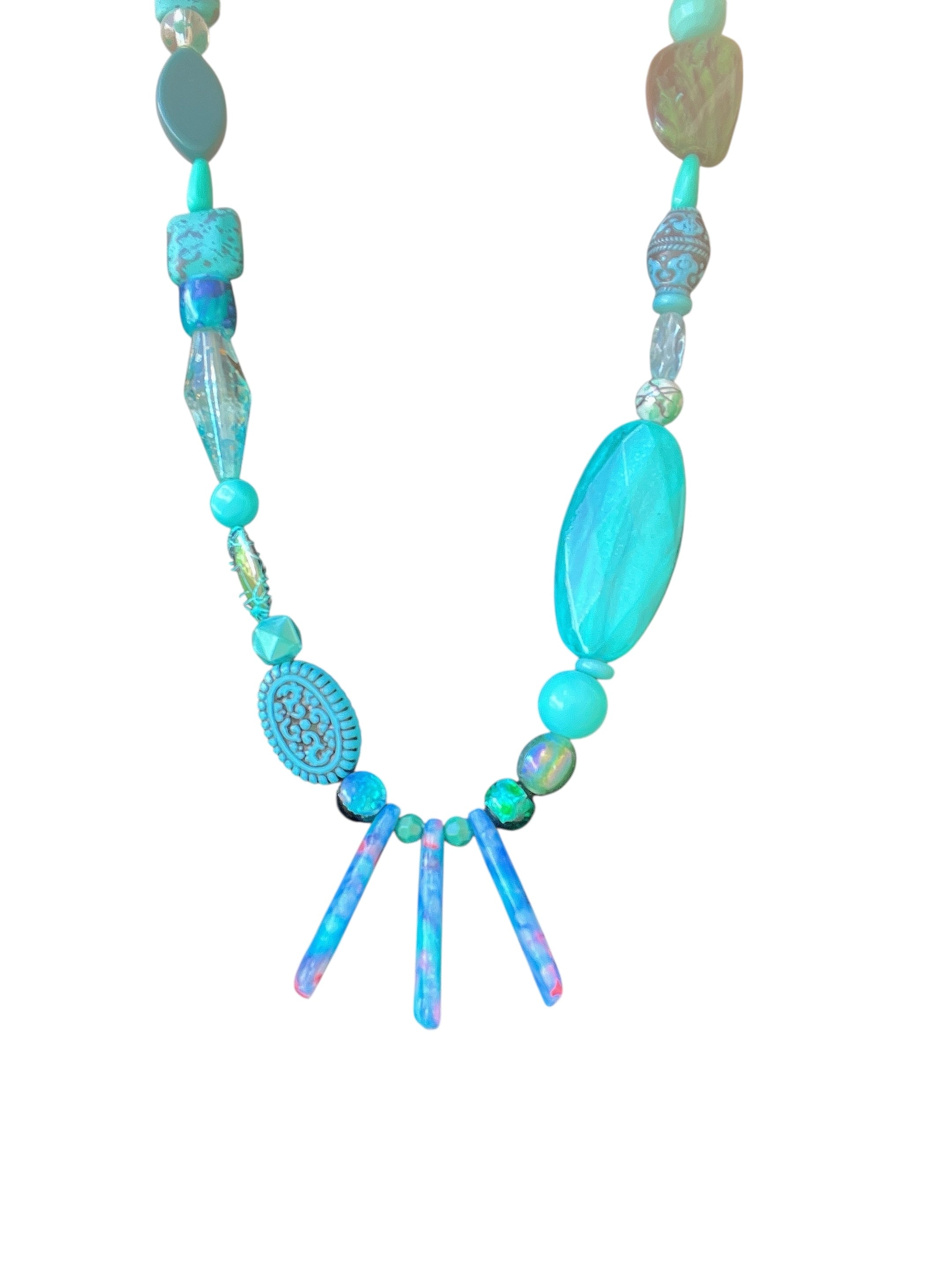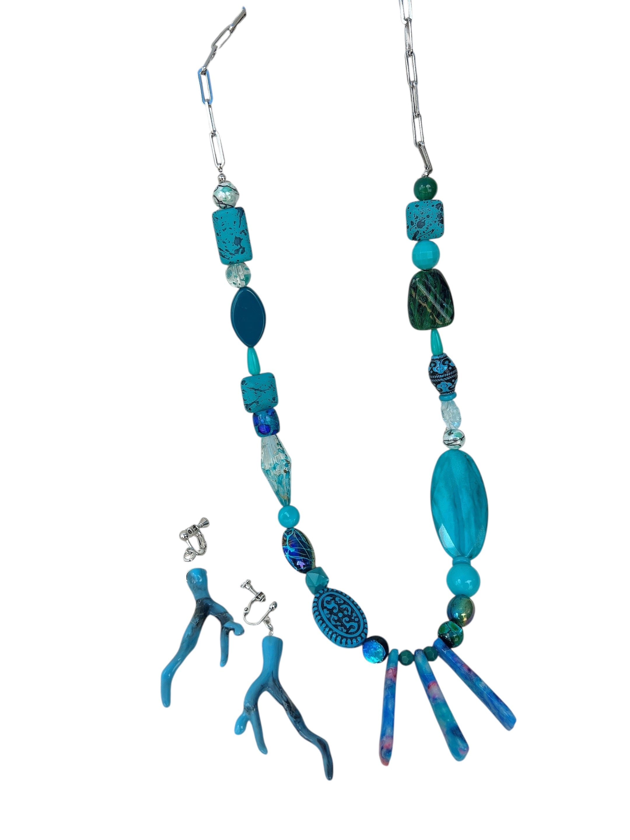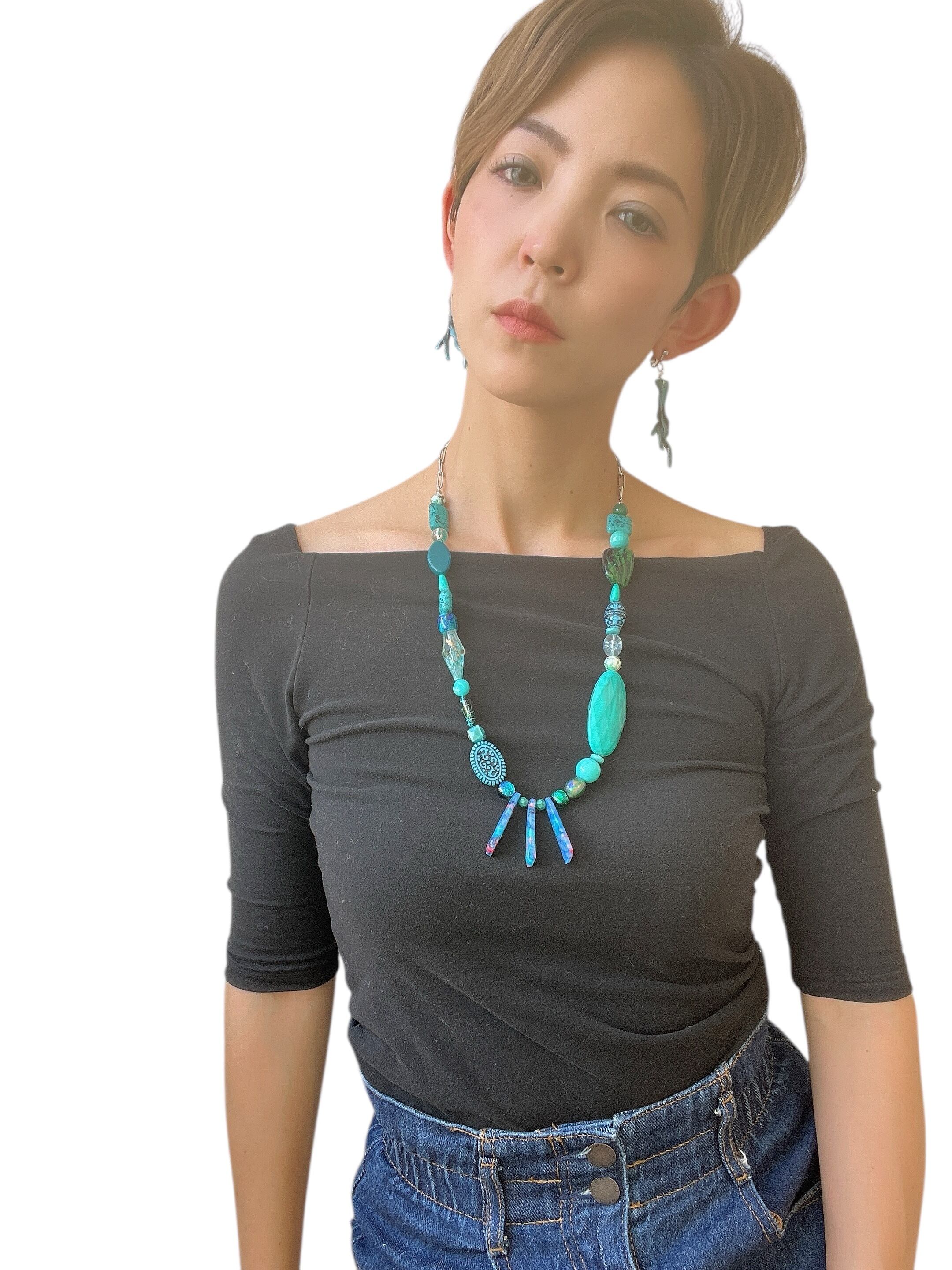 ターコイズブルーとCoralが美しく調和する、沖縄の海をコンセプトにした素敵なアイテムです。大ぶりネックレスとピアス、イヤリングがセットになっており、日常の装いに沖縄の美しさを添えてくれます。
