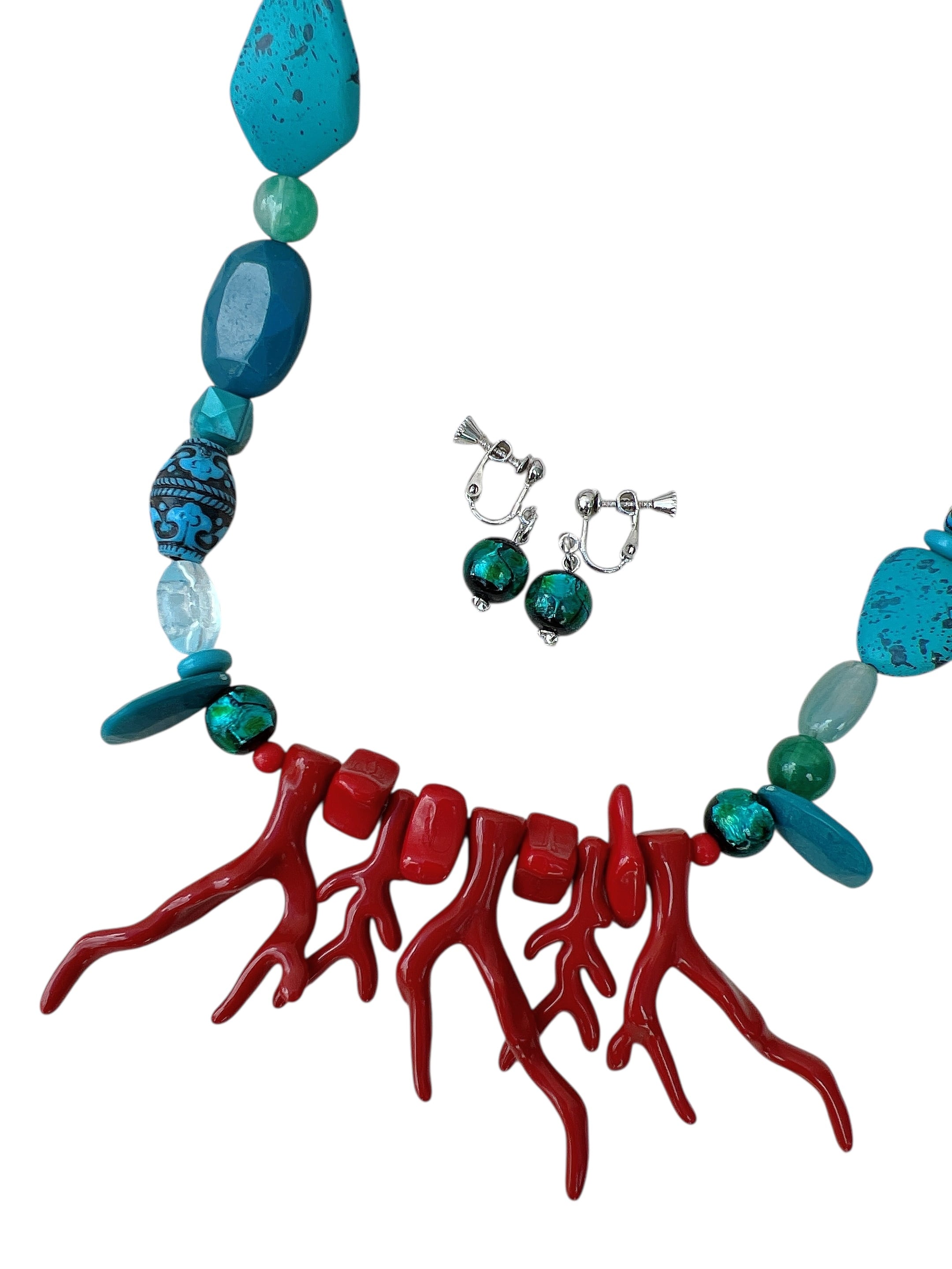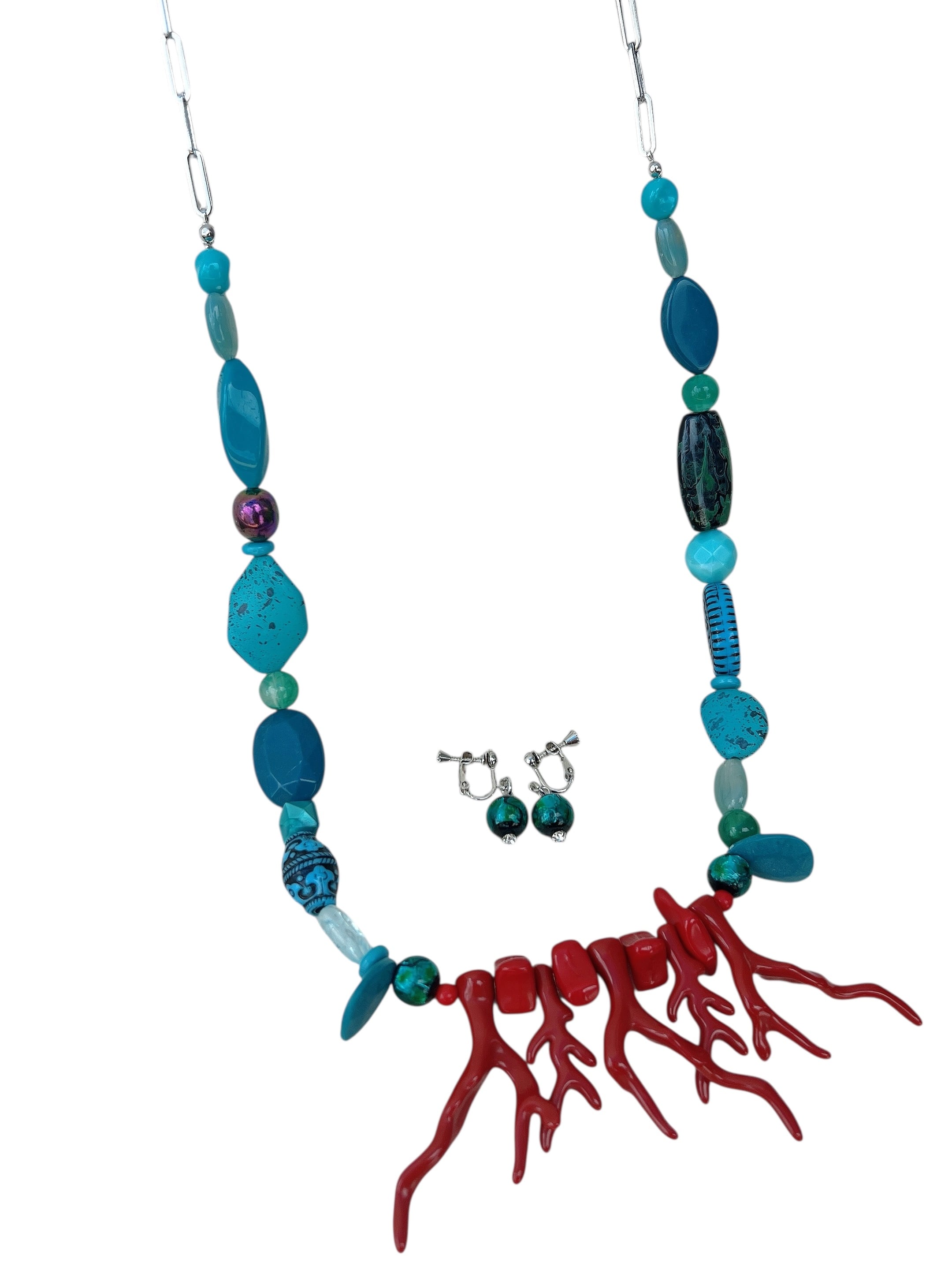 ターコイズブルーの大ぶりネックレスが印象的なアイテムです。アクセントにはCoralレッドを加え、シンプルなコーディネートに鮮やかな差し色をプラスしてくれます。